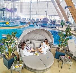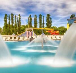 Svet zábavy, relaxu a oddychu! Súčasťou aquaparku je 13 vonkajších a vnútorných bazénov s termálnou vodou s teplotou 28°C – 38°C, tobogany a viac ako 350 vodných atrakcií. Voda pochádza z podzemného zdroja. V termálnych bazénoch pramení z hĺbky 1300 m a obsahuje viac ako 20 rôznych minerálov priaznivo pôsobiacich na zdravie človeka.